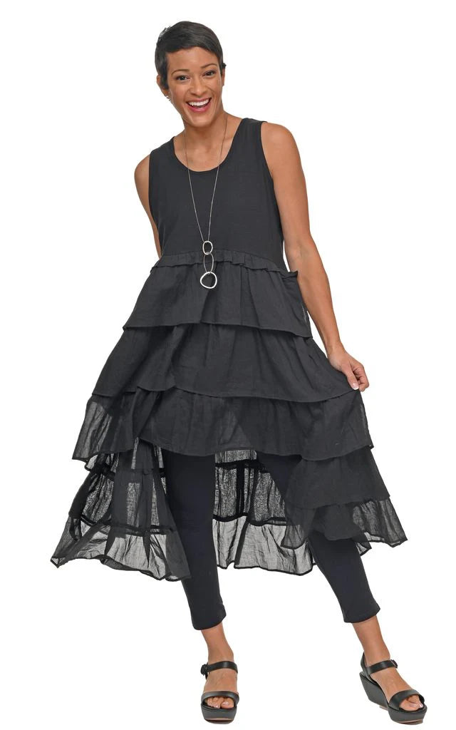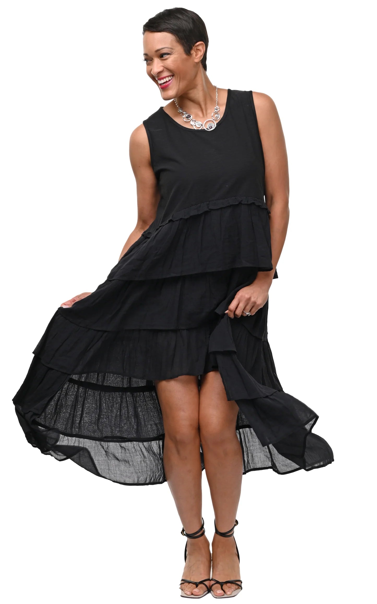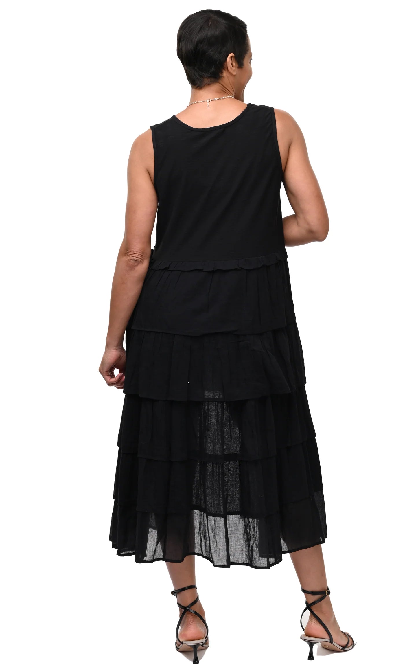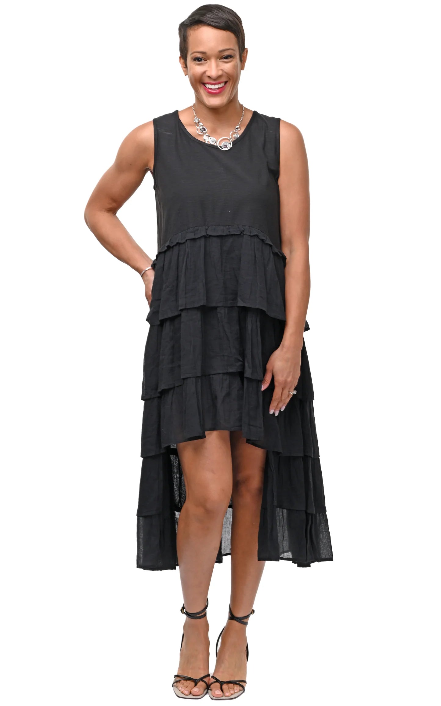 Sleeveless tier tank dress with multiple tiers on front and back.
