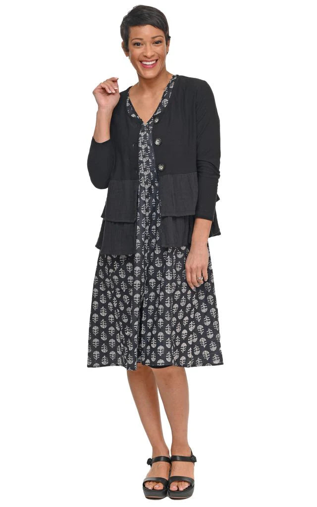 This exquisite cardigan features bracelet length sleeves and three large, decorative buttons at the top, while the bottom is adorned with delicate ruffles. With a combination of cotton slub and gauze, it's a perfect blend of comfort and style.
