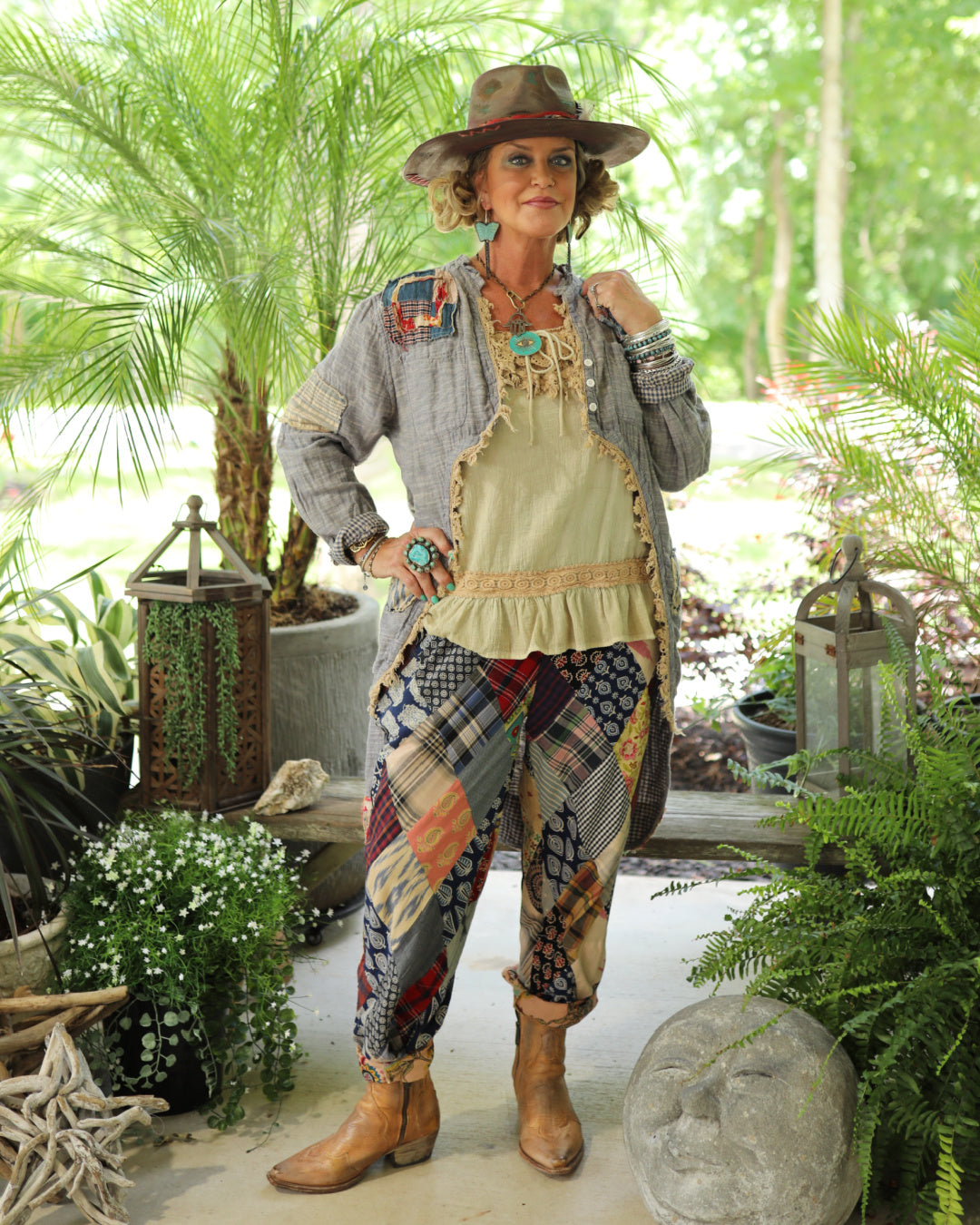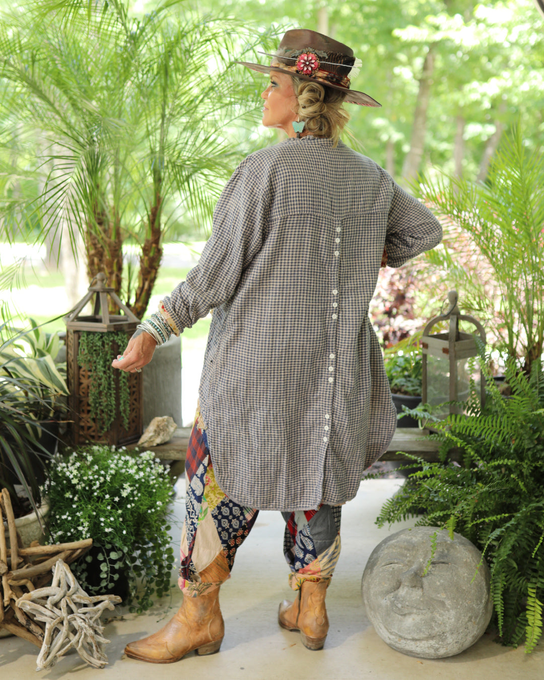 This reversible jacket is all about fanfare! On one side, it's light blue chambray with colorful patches and vintage style crochet lace trim. But flip it inside out and you'll find small checks in a vintage blue and beige. It's like two jackets in one! And on the checkered side, there are no patches or pockets to distract from its clean, classic look. Talk about versatile!