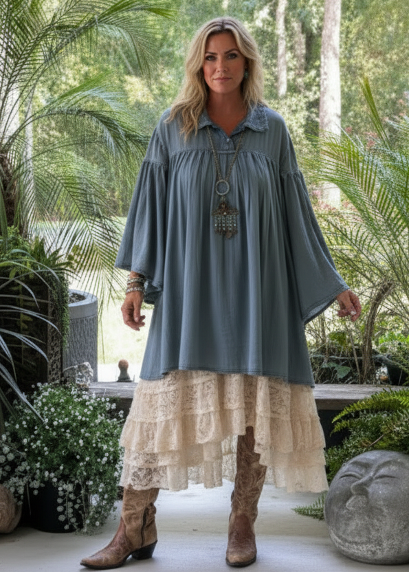 This timeless Jaded Gypsy tunic pairs sophisticated pleating with everyday wearability. Made from soft 100% cotton chambray, it showcases long sleeves and a structured collar that elevates any casual look. Perfect for layering or wearing on its own, this piece transitions seamlessly from season to season.
