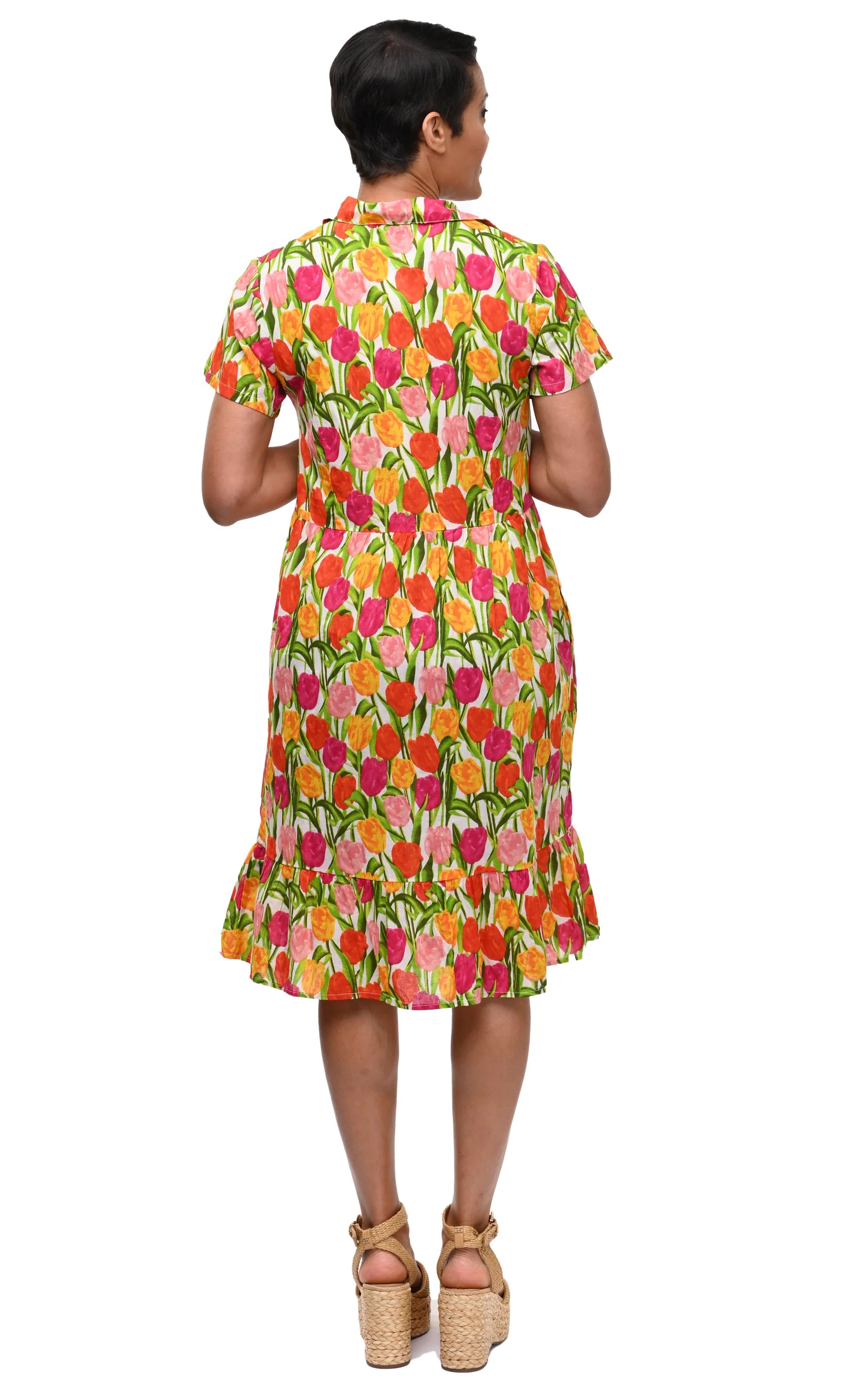 Playful and fresh, the Britney Dress in Tulips brings a burst of color to your everyday wardrobe. Made from breathable cotton, it’s designed with a relaxed fit that floats away from the body while a slightly tapered waist and chest darts add subtle shaping. A collared split neckline and button front provide classic structure, while the short sleeves and tiered hem give it an easy, feminine finish. Hidden side-seam pockets make it as practical as it is fun, perfect for slipping into on sunny days, weekend getaways, or casual evenings out.