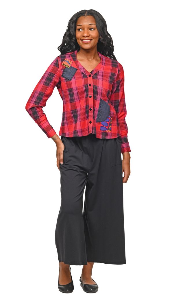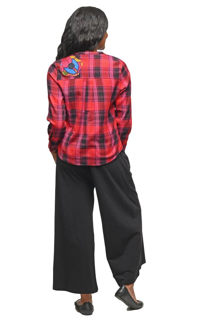 This flannel blouse features an open collar and long sleeves with tailored cuffs, combining comfort with refined style. Designed with front darts and a tapered waist, it offers a flattering, fitted silhouette. Delicate floral and denim patches on both the front and back add subtle, sophisticated detailing to this versatile piece. CV1233