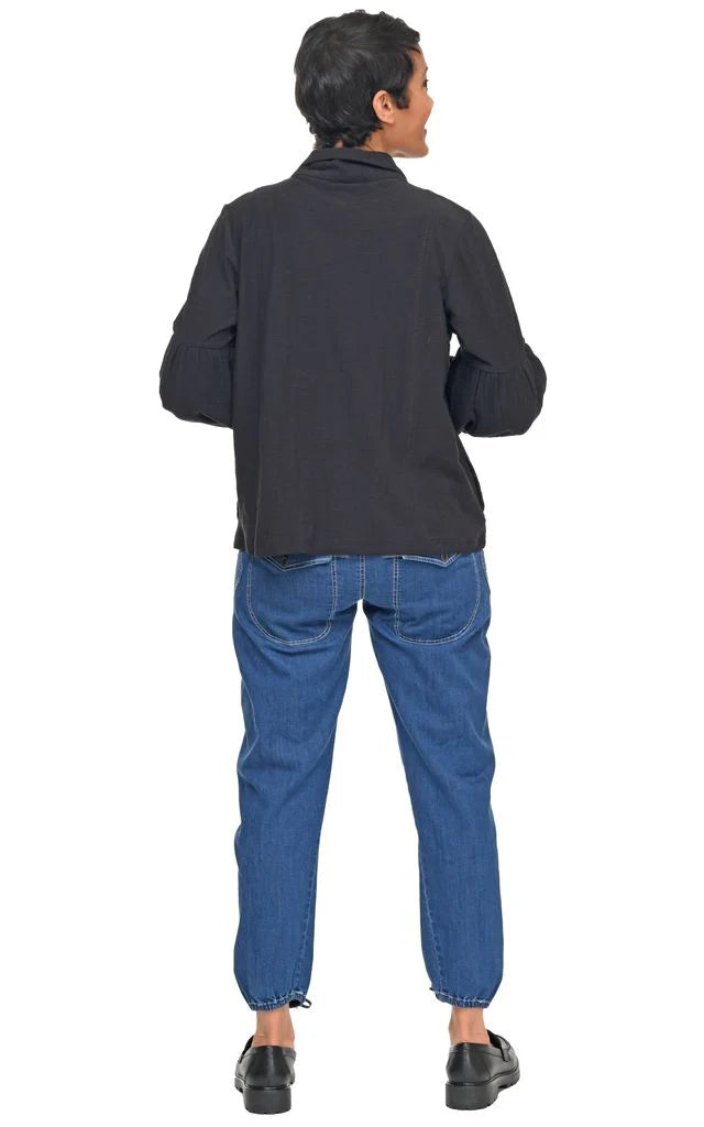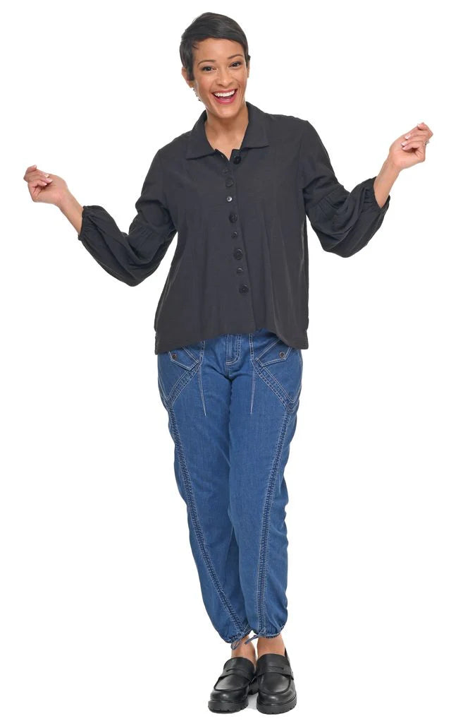 McKenna Blouse is a versatile piece that effortlessly transitions from top to jacket with its button-down style and bracelet length sleeves. Adorned with alternating sized buttons, front pockets, and princess seams, its balloon sleeves add a touch of sophistication to any look.