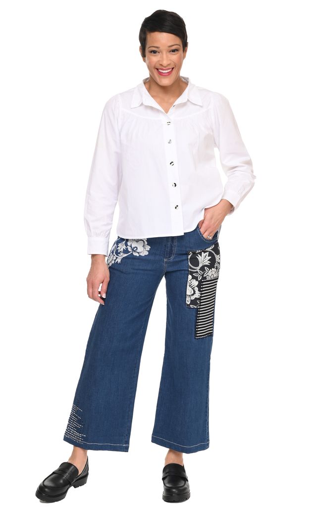 Sadie Blouse in White features a collared button down with a curved twin stitch at the top of the chest. The slightly poufy sleeves and cuffs add a touch of sophistication, making this blouse perfect for any occasion.