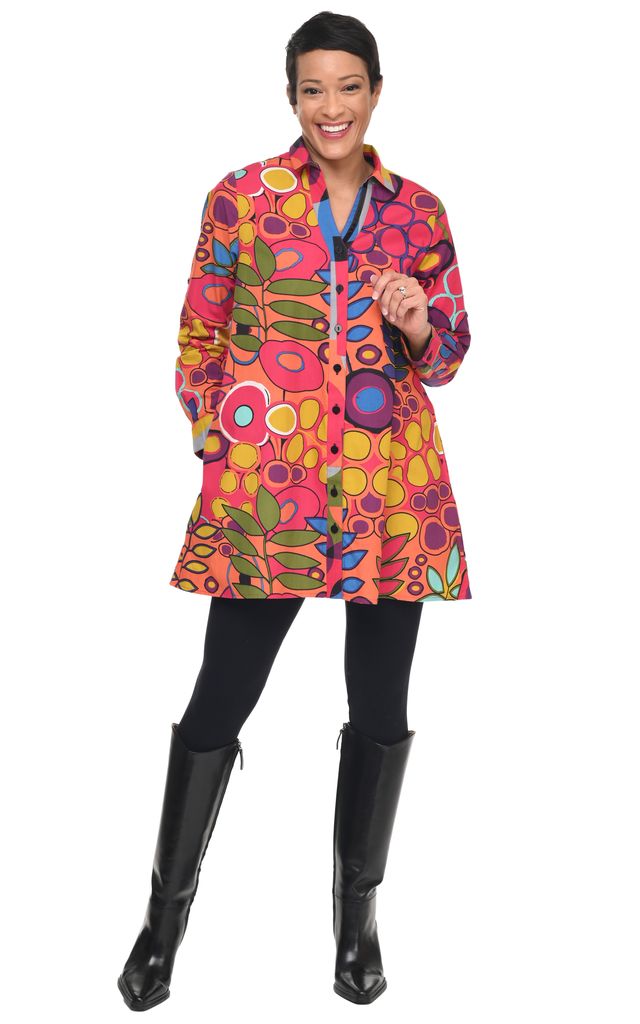 This tunic-length A-line blouse is crafted from soft coordinating cotton prints and boasts elegant ribbon trim, cuffs, and pockets. Elevate your wardrobe with this exclusive piece, perfect for the sophisticated and stylish.