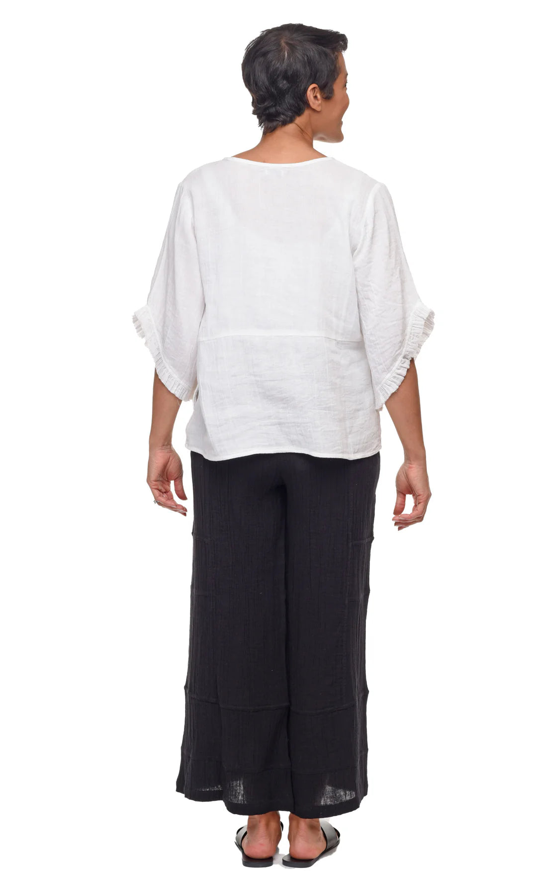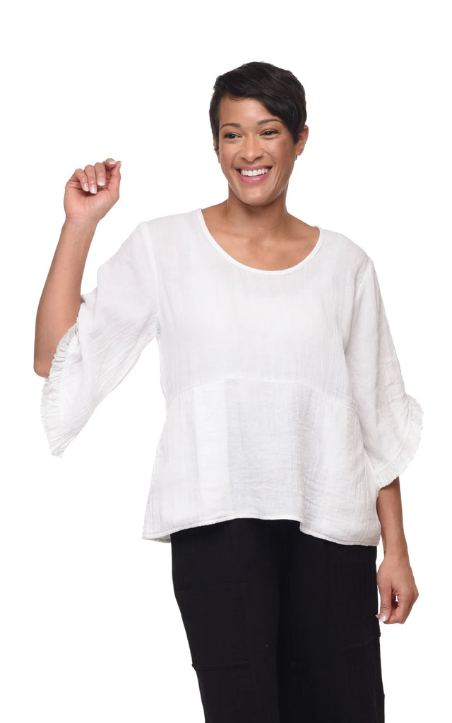 3/4 sleeve pullover with round neckline, bodice seam, raw ruffle finish on the ends of the sleeves and front pockets.