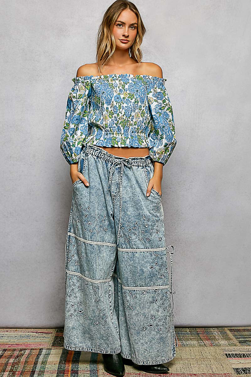 POL Floral Print Smocked Off-Shoulder Womens Blouse