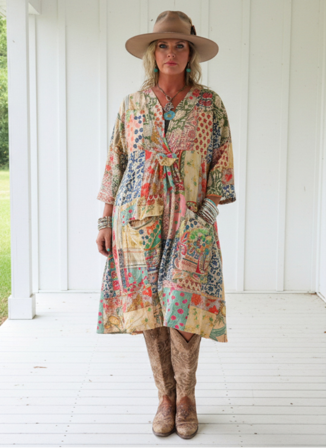 Discover effortless elegance with the Afternoon Garden Views Dress from Jaded Gypsy. Crafted from 100% cotton, this one-size dress features a charming multi-print design paired with practical front pockets and subtle pleating. The relaxed V-neckline and three-quarter sleeves offer comfortable, versatile styling for any occasion.
