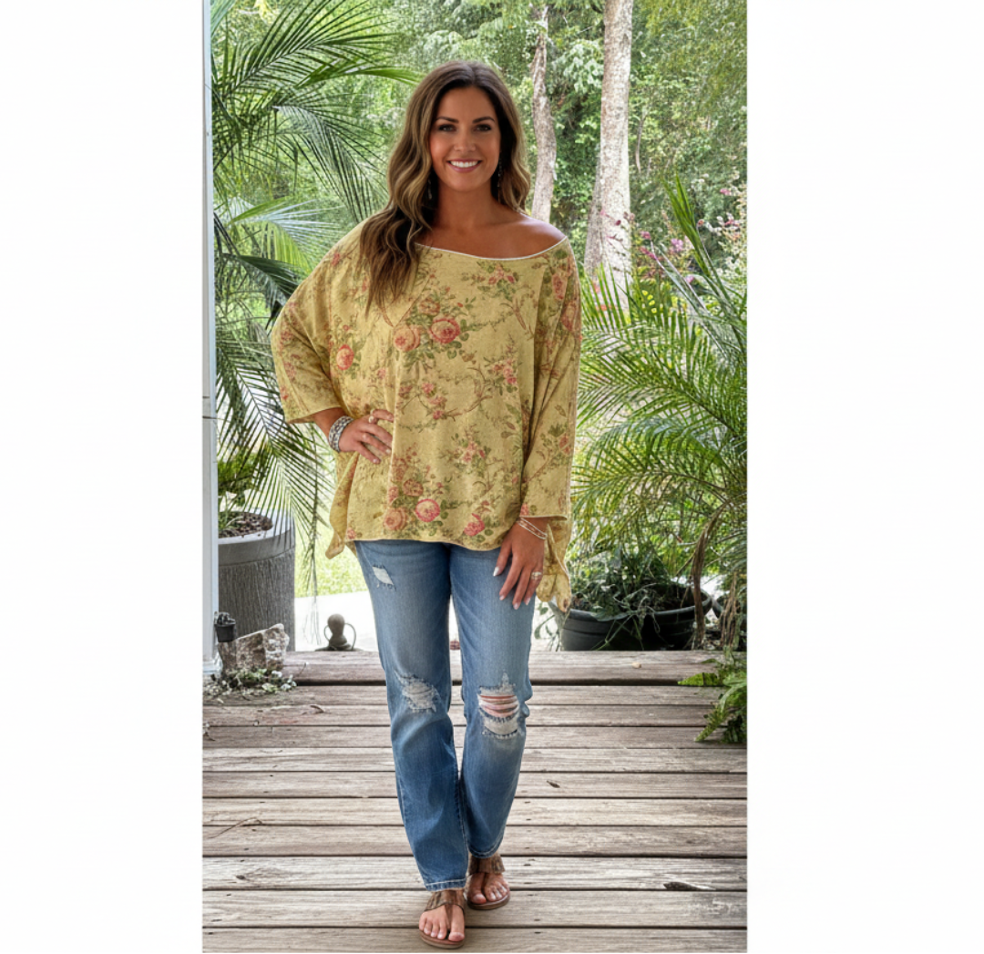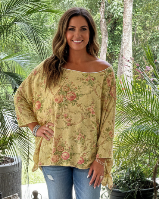 Embrace your inner free spirit in this gloriously OVERSIZED!! Be Free Top, featuring a dreamy Meadow Mist floral print that's basically a wearable meadow. Perfect for those days when you want to look effortlessly cool while practically disappearing into a cloud of fabric. With a 78" bust and 27" length, this isn't just a top—it's a cozy hug you can wear. Ideal for lounging, wandering, or pretending you have your life together.