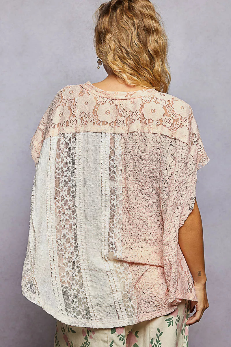 POL Clothing Asymmetrical V-Neck Short Sleeve Lace Womens Top