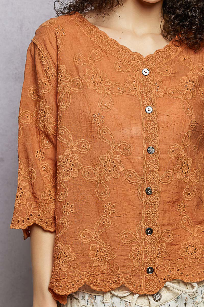 This short sleeve shirt is designed with a flattering V-neck and relaxed fit for a comfortable wear. Crafted in crochet fabric, it offers a bohemian touch to the look. The button closure adds a classic and timeless detail. Featuring scalloped opening detail and vintage washing, this shirt exudes a unique and vintage-inspired style. Available in a solid color, this versatile piece can be easily paired with different bottoms for a chic and effortless outfit.