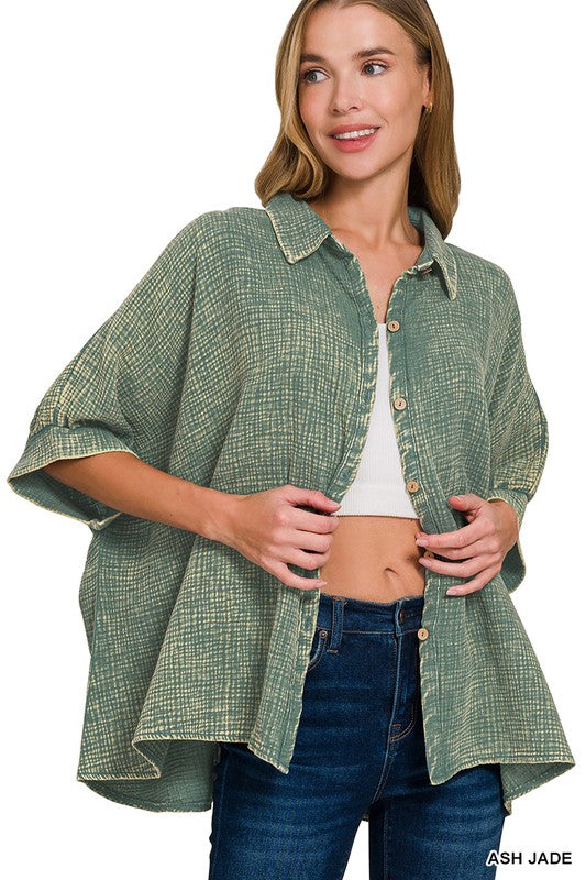 Get ready to rock the oversized look with this double gauze button down shirt! With a banded half sleeve and collar, you'll be the ultimate fashion icon. Trust us, this shirt is "washed" to perfection. So go ahead, embrace the oversized life! (Color may vary Slightly due to monitor resolution)