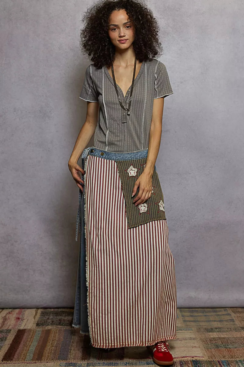 This top features a designed V-neck placket and short sleeves for a stylish look. It has a regular fit and is made from textured knit fabric. The stitch seam detail adds visual interest to the piece. The pointed solid pattern provides a unique and modern touch. Overall, this top offers a blend of fashionable design and comfortable wear.