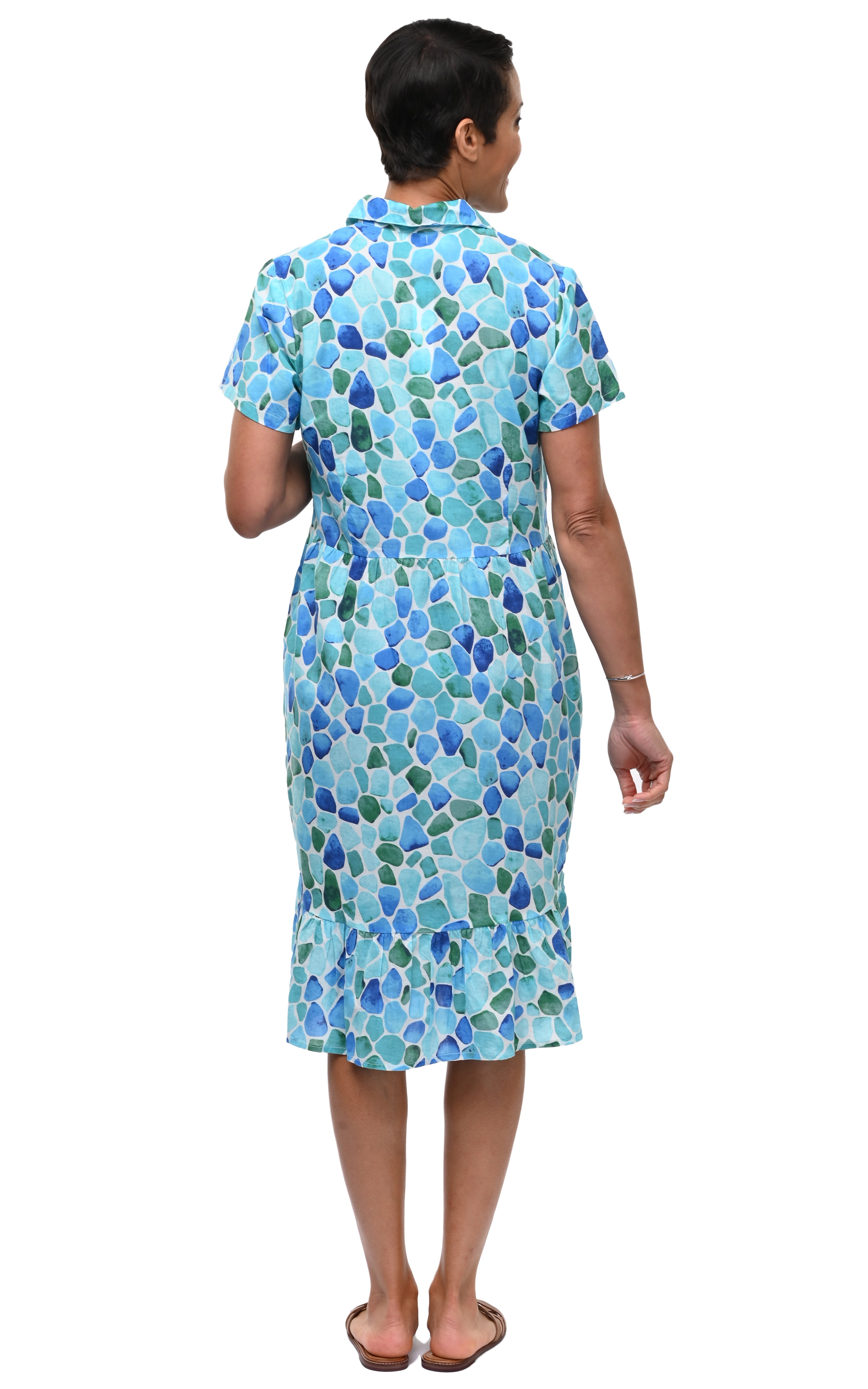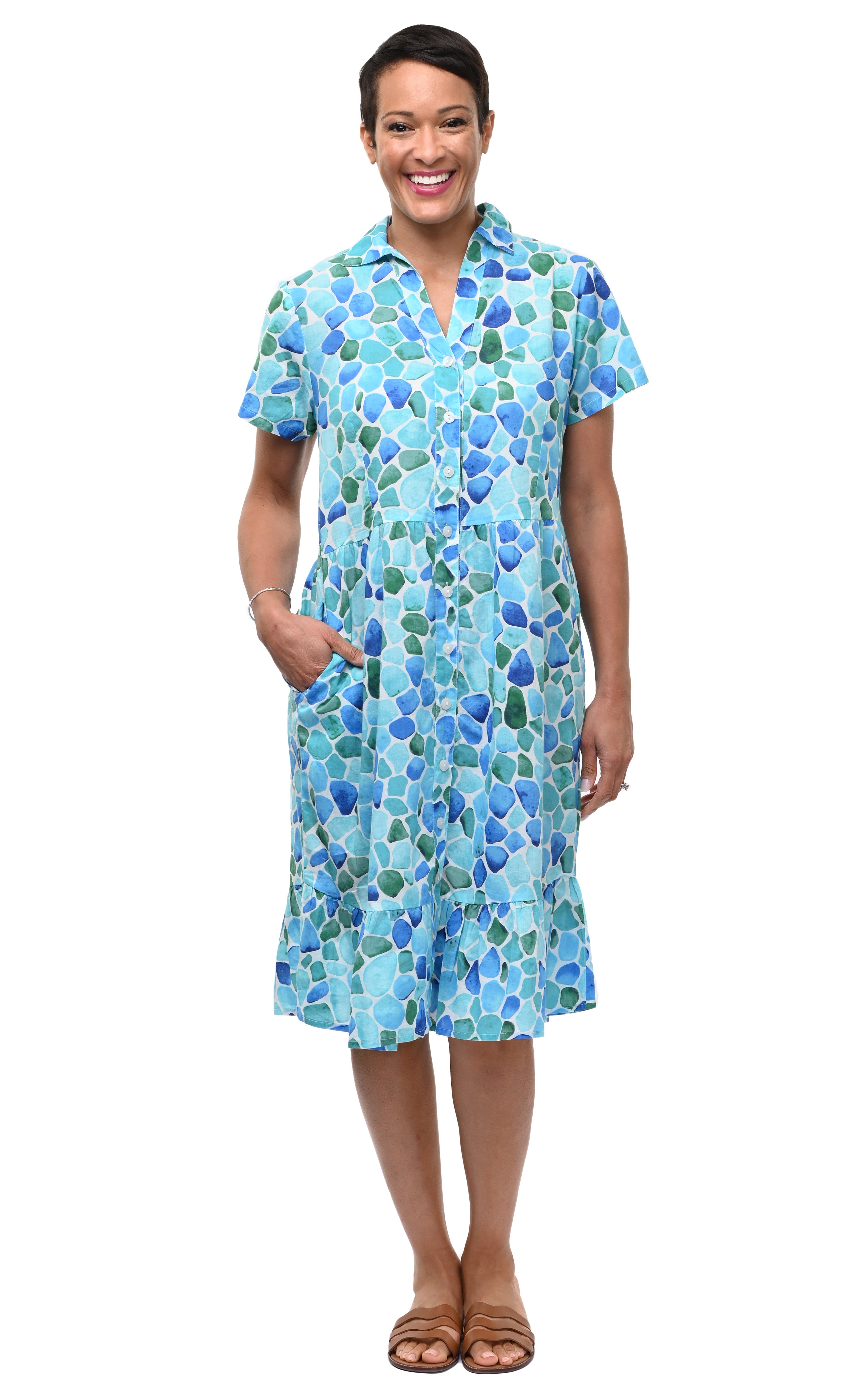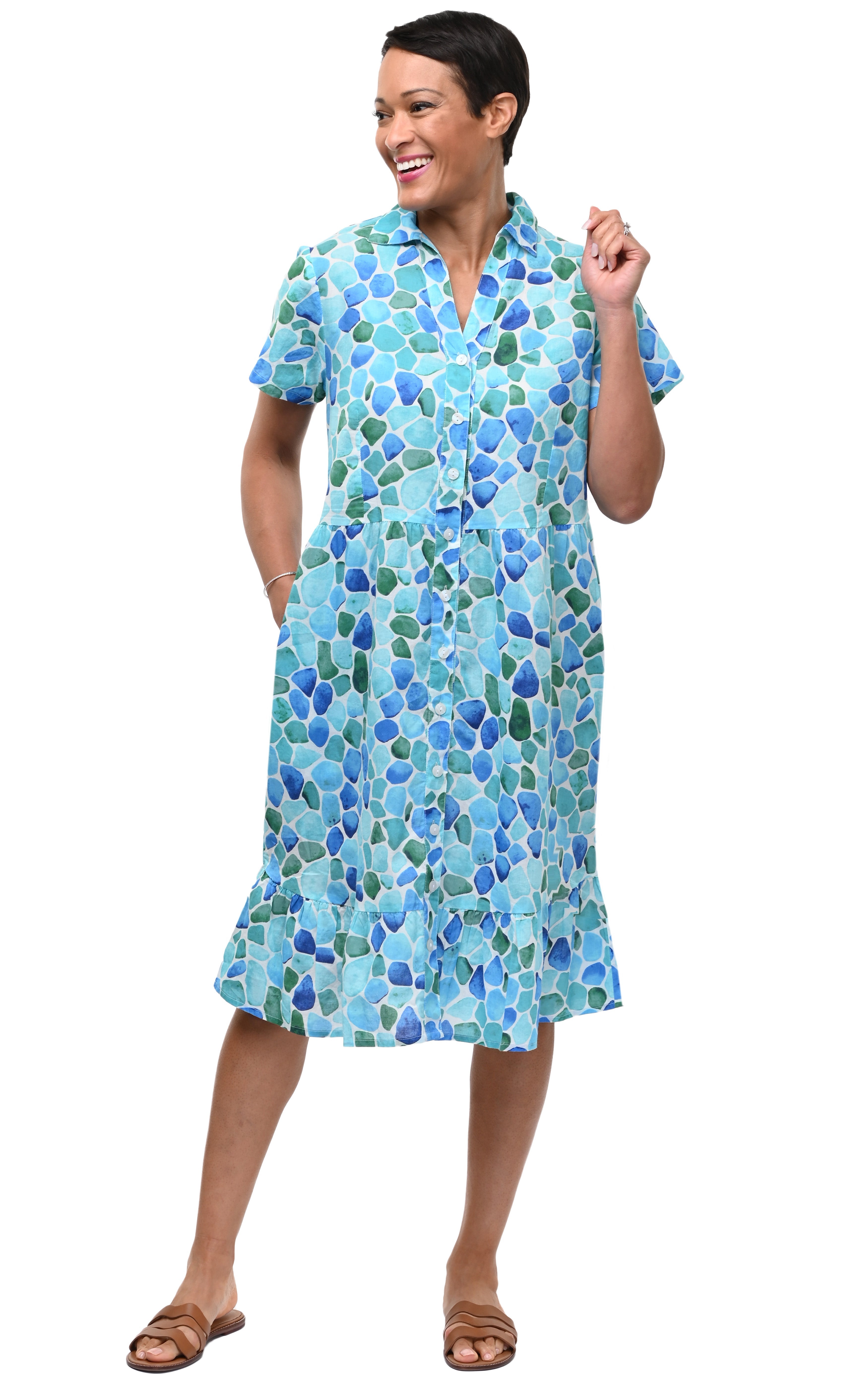 Playful and fresh, the Britney Dress in Sea Glass brings a burst of color to your everyday wardrobe. Made from breathable cotton, it’s designed with a relaxed fit that floats away from the body while a slightly tapered waist and chest darts add subtle shaping. A collared split neckline and button front provide classic structure, while the short sleeves and tiered hem give it an easy, feminine finish. Hidden side-seam pockets make it as practical as it is fun, perfect for slipping into on sunny days, weekend getaways, or casual evenings out.