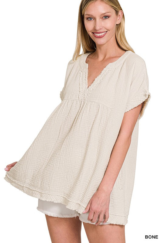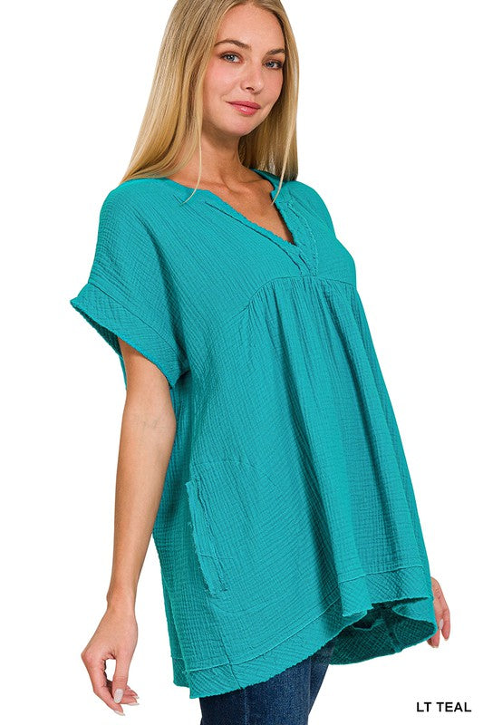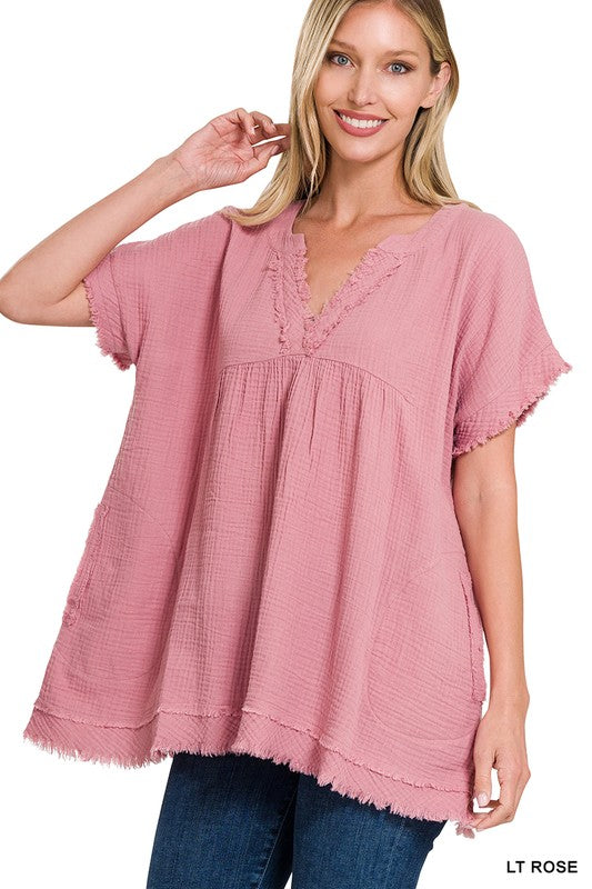 Unleash your carefree spirit with our Zenana Double Gauze Raw Edge Shirt. Designed with a playful raw edge and convenient pockets, this short sleeve pullover is made of soft, double cotton gauze for ultimate comfort. Available in several colors and sizes S-XL.