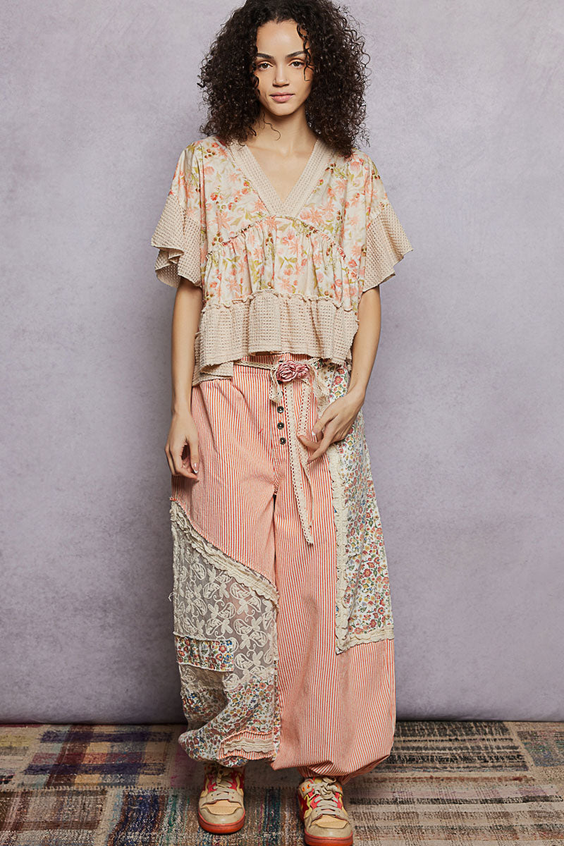 POL Floral Print V-Neck Woven Blouse with Gentle Gathers